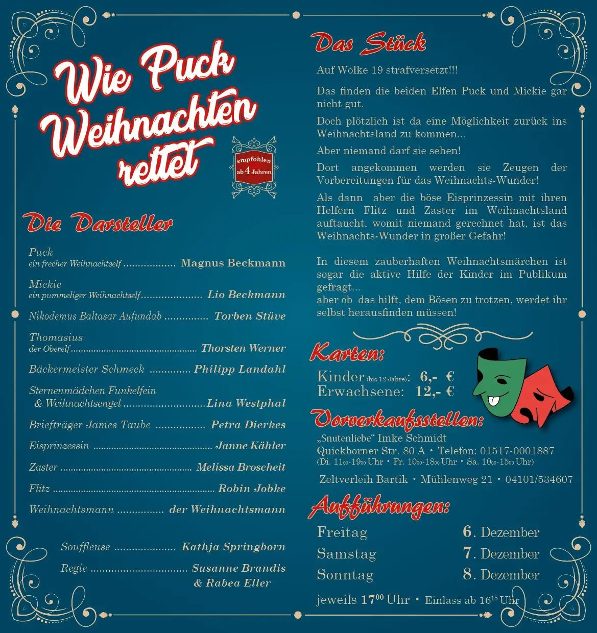 In diesem zauberhaften Weihnachtsmärchen ist sogar die aktive Hilfe der Kinder im Publikum gefragt…aber ob das hilft, dem Bösen zu trotzen, werdet ihr selbst herausfinden müssen.